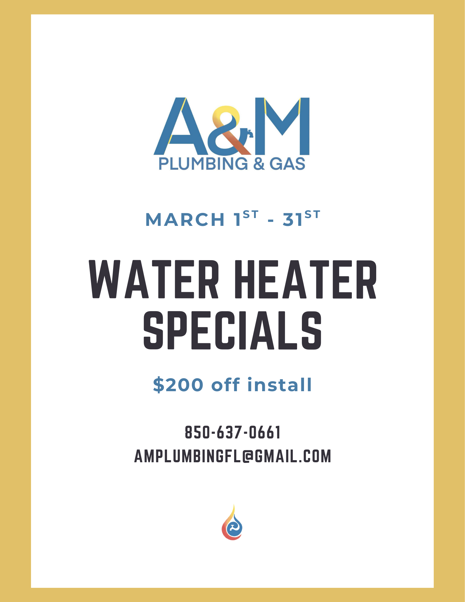 March Special * March Special * March Special * Both residential and commercial customers get $200 off the installation of any tank/tankless water heater.